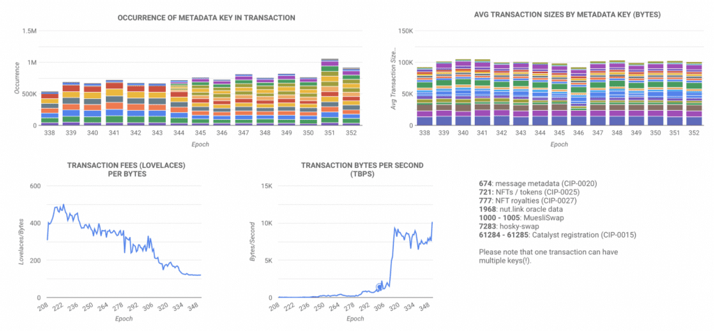 While Cardano has averaged around 1TPS since Smart Contracts were implemented at the start of Alonzo, the data usage and number of UTxO’s within blocks has significantly climbed. The main reason is that dApps have optimised their code and have become better at packing more into each block. The TBPS data below shows clearly how they are now pushing the boundaries of what can be achieved with the current blockchain limits (pre-Vasil).