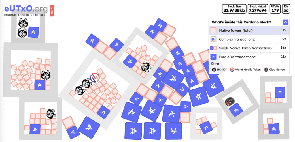eUTxO.org provides a neat visualisation of each blocks contents and enables you to see just how much can be packed into the current block limits! This typical block contains 179 eUTxOs, contained within 36 transactions. In addition the block contains 115 Native Tokens, which would require additional smart contracts on account based chains like Ethereum. You will note that this block used 82.9kB of the maximum block size permitted at this time (88kB), allocation varies based on the pending transactions in mempool.